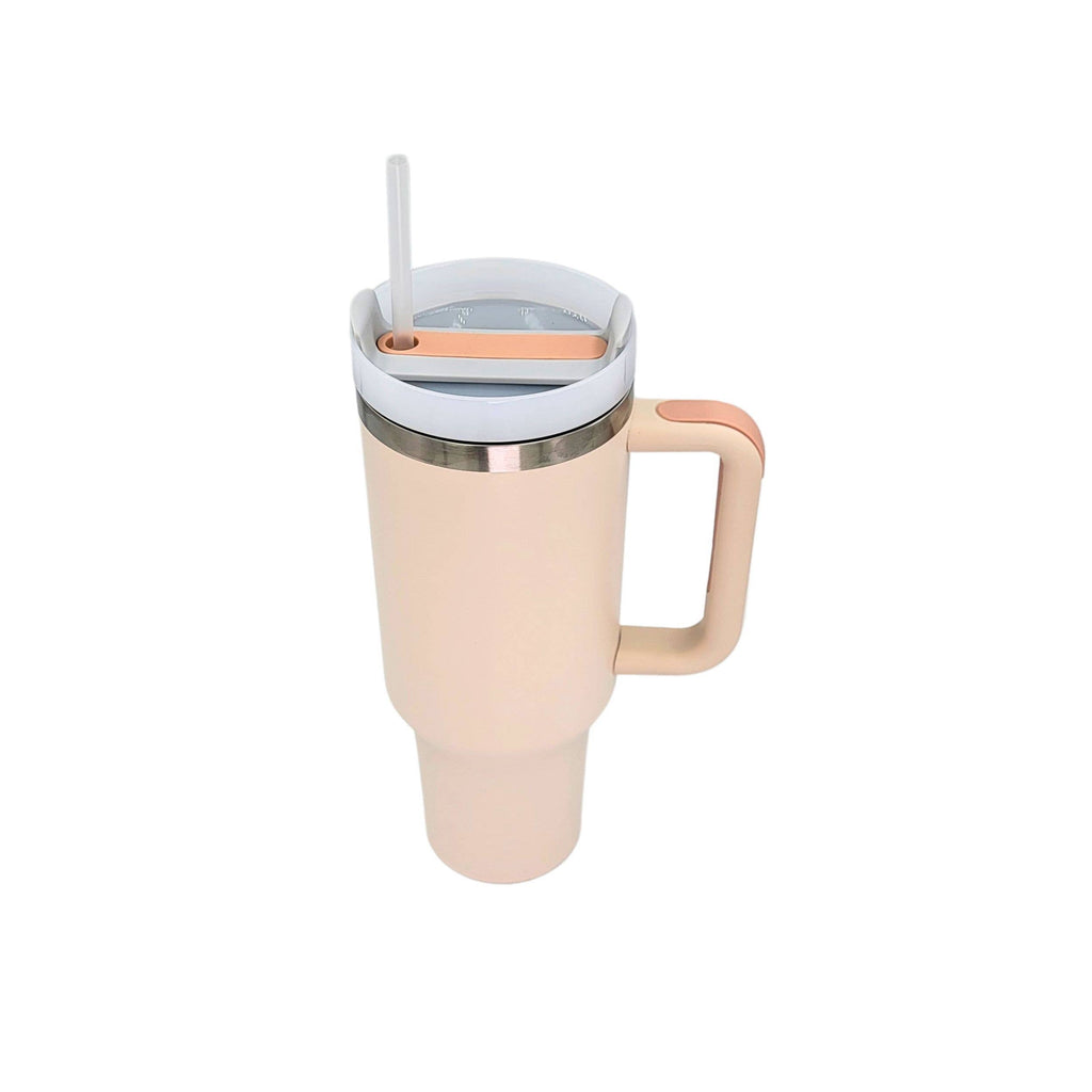 Engraved In The USA 40 oz handled tumbler with a durable powder coated color that included a straw. All tumblers are engraved to insure the writing will never peal or fade.