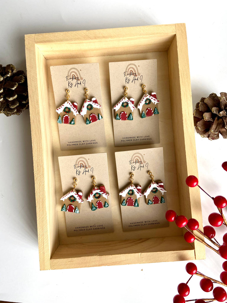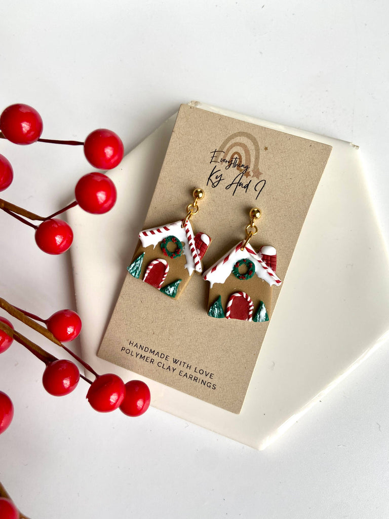 Tiny detailed gingerbread house. Made with polymer clay and liquid polymer clay. These dangle at 1.25 inches and are attached to gold plated stainless steel ball posts.