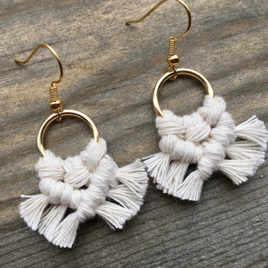 These beautiful mini micro macrame earrings were hand knotted with a natural beige colored cotton cord on round gold plated rings. These are lightweight to wear and have nickel free gold plated earring wires. Each earring is 2 1/4 inches long and 1 1/2 inch wide. Perfect size for those who prefer to wear smaller earrings.