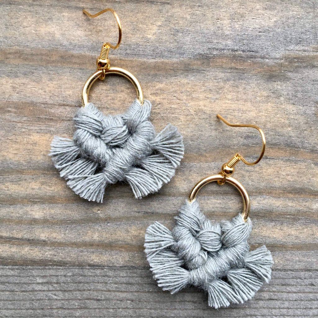 This pair of tiny macrame earrings were hand knotted with sage colored cotton cord on round gold plated rings. These are lightweight to wear and have nickel free gold plated earring wires. Each earring is 2 1/4 inches long and 1 1/2 inch wide. Perfect size for those who prefer to wear smaller earrings. Be sure to check out the rest of my micro-macrame jewelry in the shop!