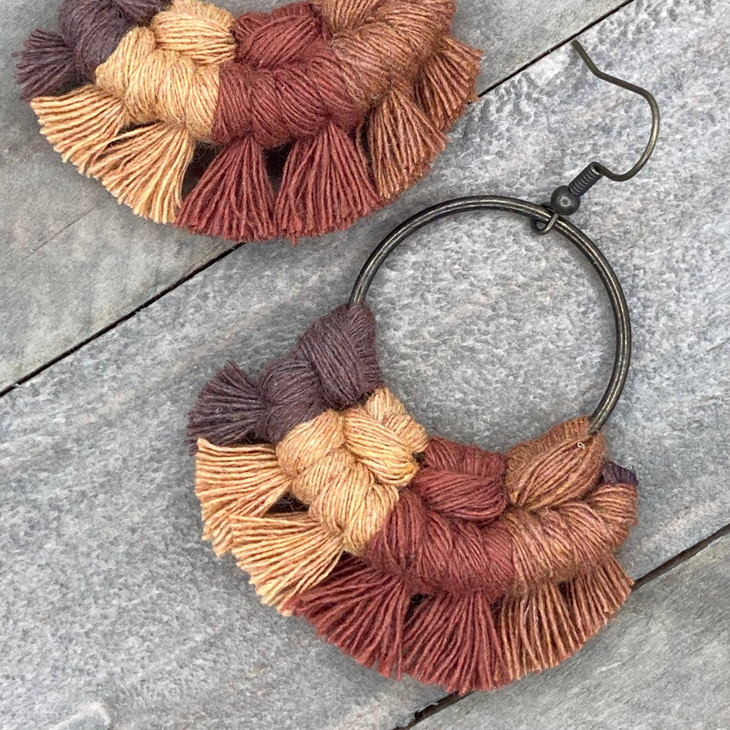 This pair of beautiful macrame earrings were hand knotted and fringed at the edges with brown, marigold, burnt orange and cinnamon colored cotton cord. These are surprisingly lightweight to wear and have nickel free antique bronze earring wires. Each round shaped earring is 1 1/2 inches long and about 1 inch wide. Be sure to check out the rest of my micro-macrame jewelry in the shop!