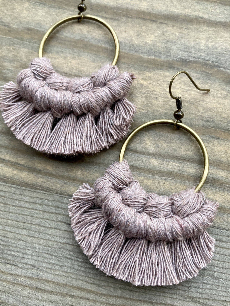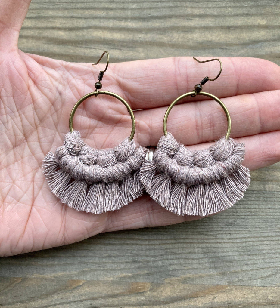 This pair of beautiful macrame earrings were hand knotted and fringed at the edges with dusty mauve colored cotton cord.