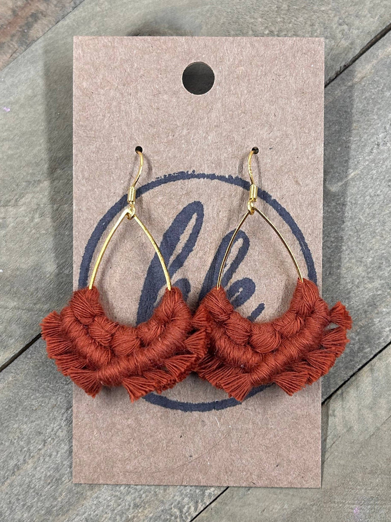 HK Macrame Jewelry - Small Teardrop Fringe Earrings - Cider Orange & Gold