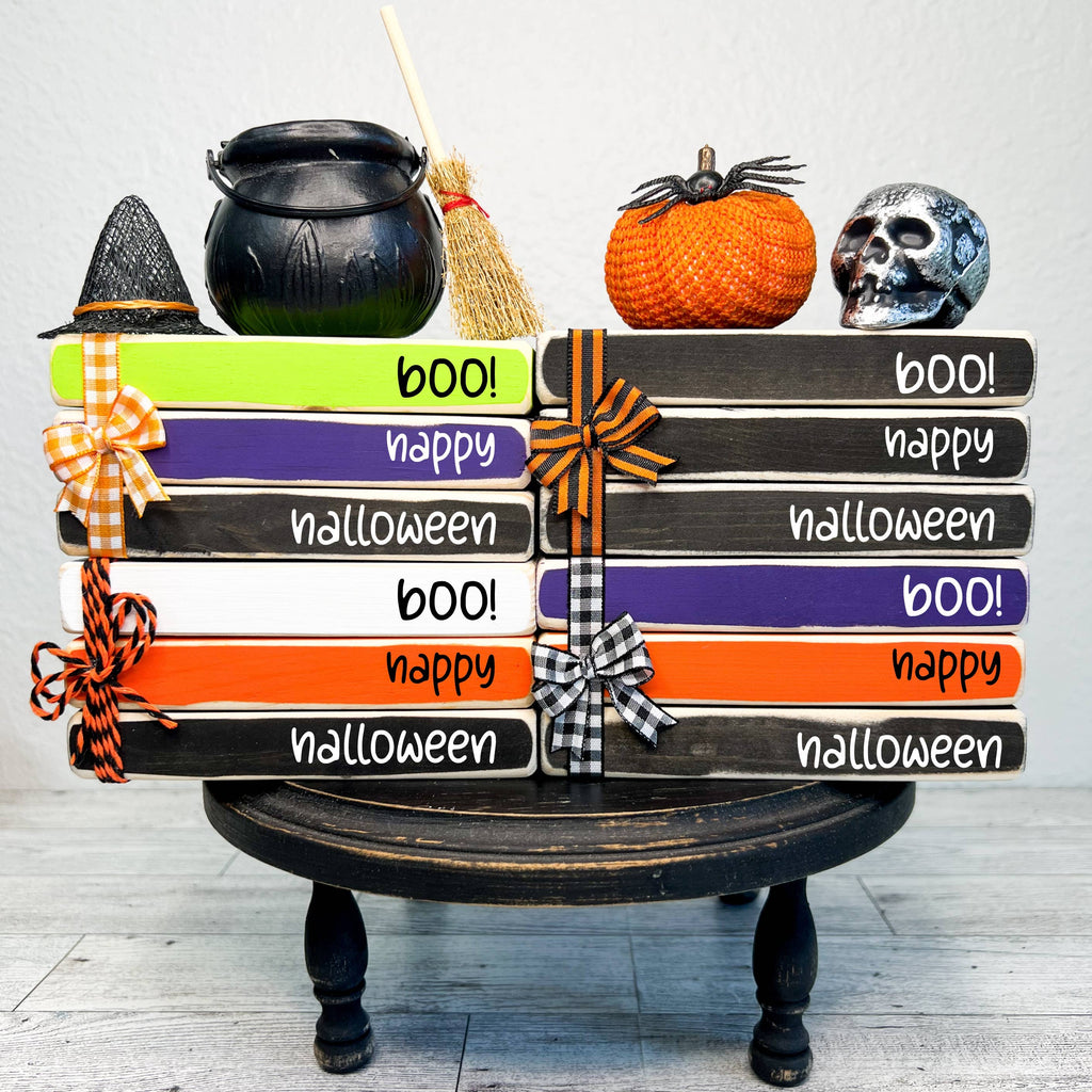 Ruaille Buaille Co - October home decor | Mini book stacks for Halloween - Boo