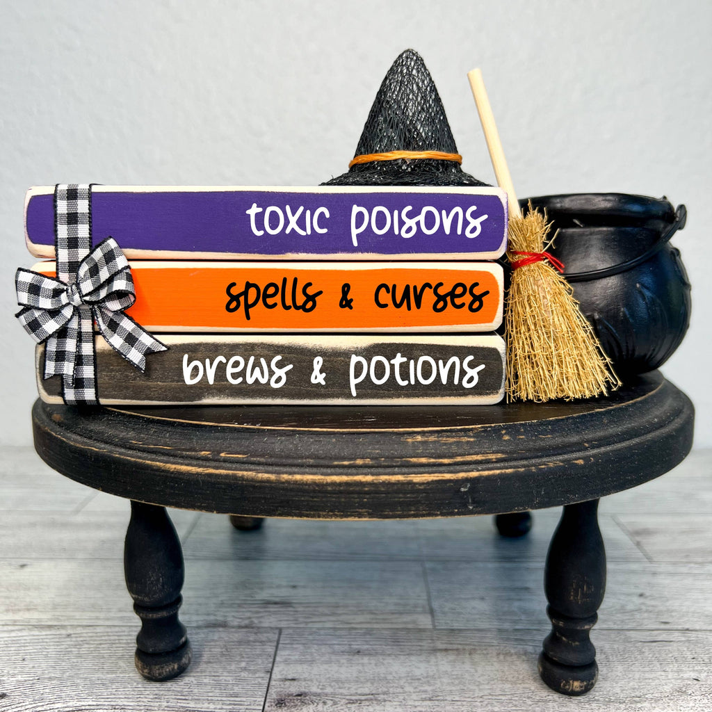 Mini book stack, fall home decor, autumn tiered tray, farmhouse fall decor, October tiered tray, entryway table decor, fireplace mantle decor, shelf sitter, tabletop decor, rustic autumn decor, halloween decor, Halloween tiered tray, October decor, farmhouse halloween, all hallows eve, its spooky season, black cats, spooky bats, witches hats, toxic poisons, spells and curses, brews and potions, haunted houses, jack o lanterns, ghost stories, ghouls ghosts goblins, i put a spell on you, October 31st, it’s just a bunch of hocus pocus, this is halloween, trick or treat