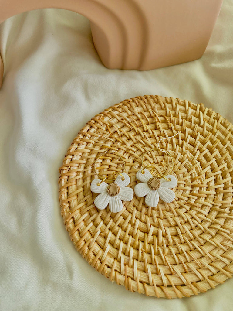 handmade drop dangle daisy earrings; handmade out of polymer clay; lightweight; hypoallergenic gold findings